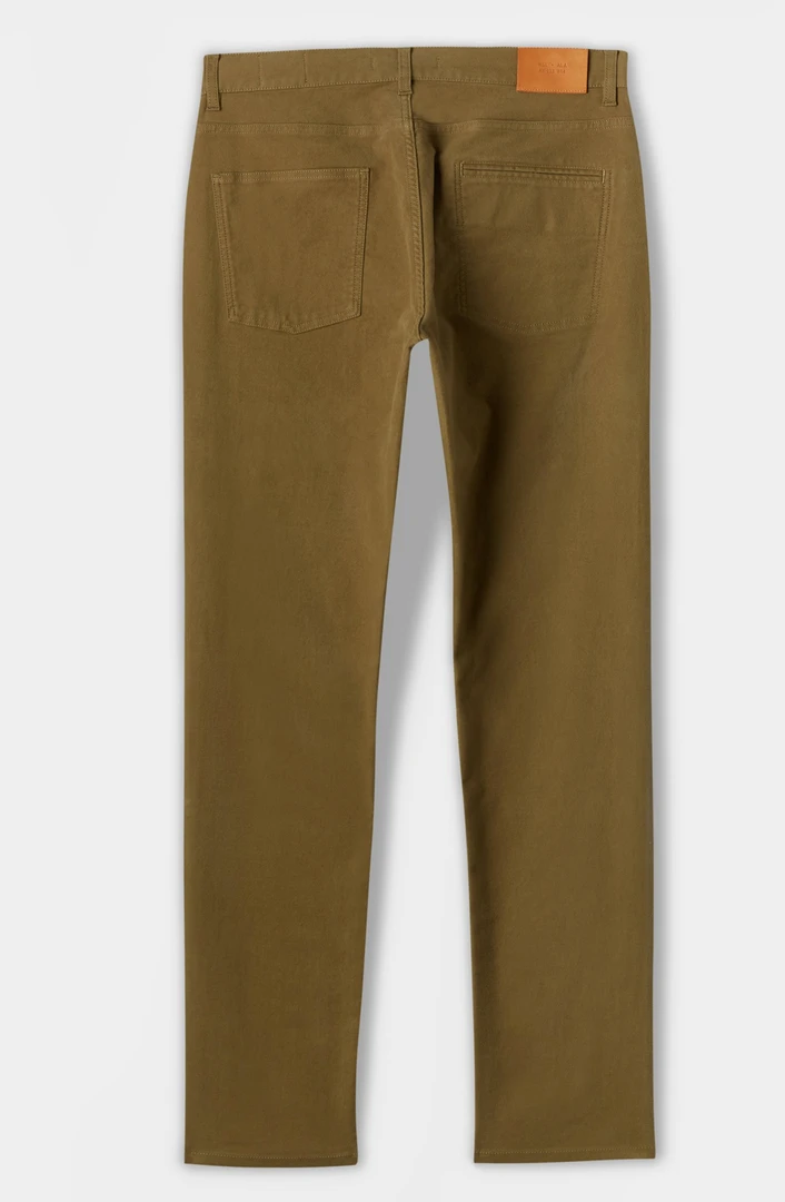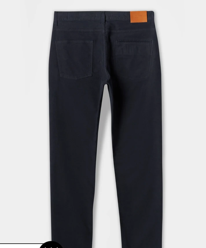 slim fit moleskin jeans are made with a hint of stretch for added comfort, and finished with luxe details like an antique brass button at the front center, and a vegetable-tanned leather patch at the waist.