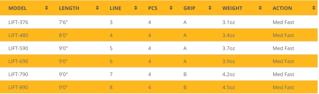 | Size | Lift 376( 7'6" 3WT), Lift 480 (8' 4WT), Lift 590 ( 9' 5WT), Lift 690 (9' 6WT), Lift 790 (9' 7WT), Lift 890 (9' 8WT) |
