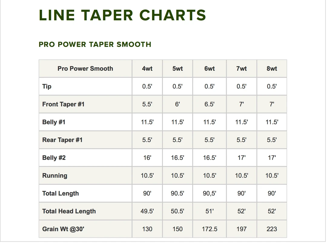 PRO Smooth Power Taper Fly Line is designed for loading faster action rods at a half-size heavier than industry standard grain weight. The advanced compound taper design allows for easier turn-over of heavier rigs including larger dries, dry-dropper rigs, nymphs, and streamers. The Power Taper will load a rod deeper and quicker than a traditionally weighted line, helping to enhance “feel” and improve timing during the cast. The 50′ head adds length for better line control and loop stability and the longer head excels at on-water maintenance for mending on longer drifts. 4 wt-8 wt.